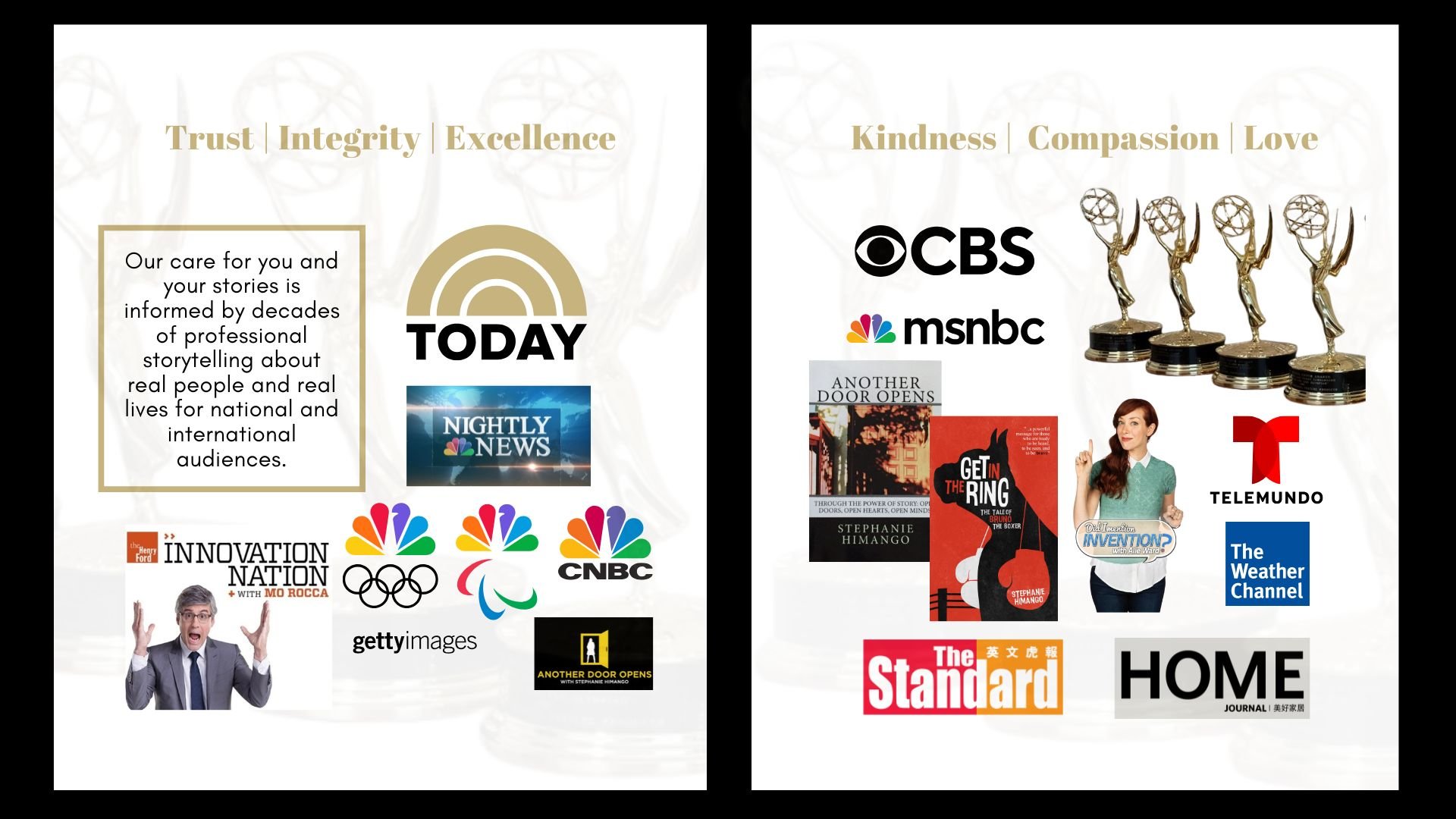 My name is Stephanie Himango, and I started Great Family Legacies to help families and organizations like yours elegantly gather and document their unique stories. I’m a 7-time Emmy Award winning television producer and writer in three different Emmy communities — News & Documentary, Sports, and Daytime Creative. At GFL, I lead a team of talented storytellers with a heart for capturing the beauty of the human spirit.